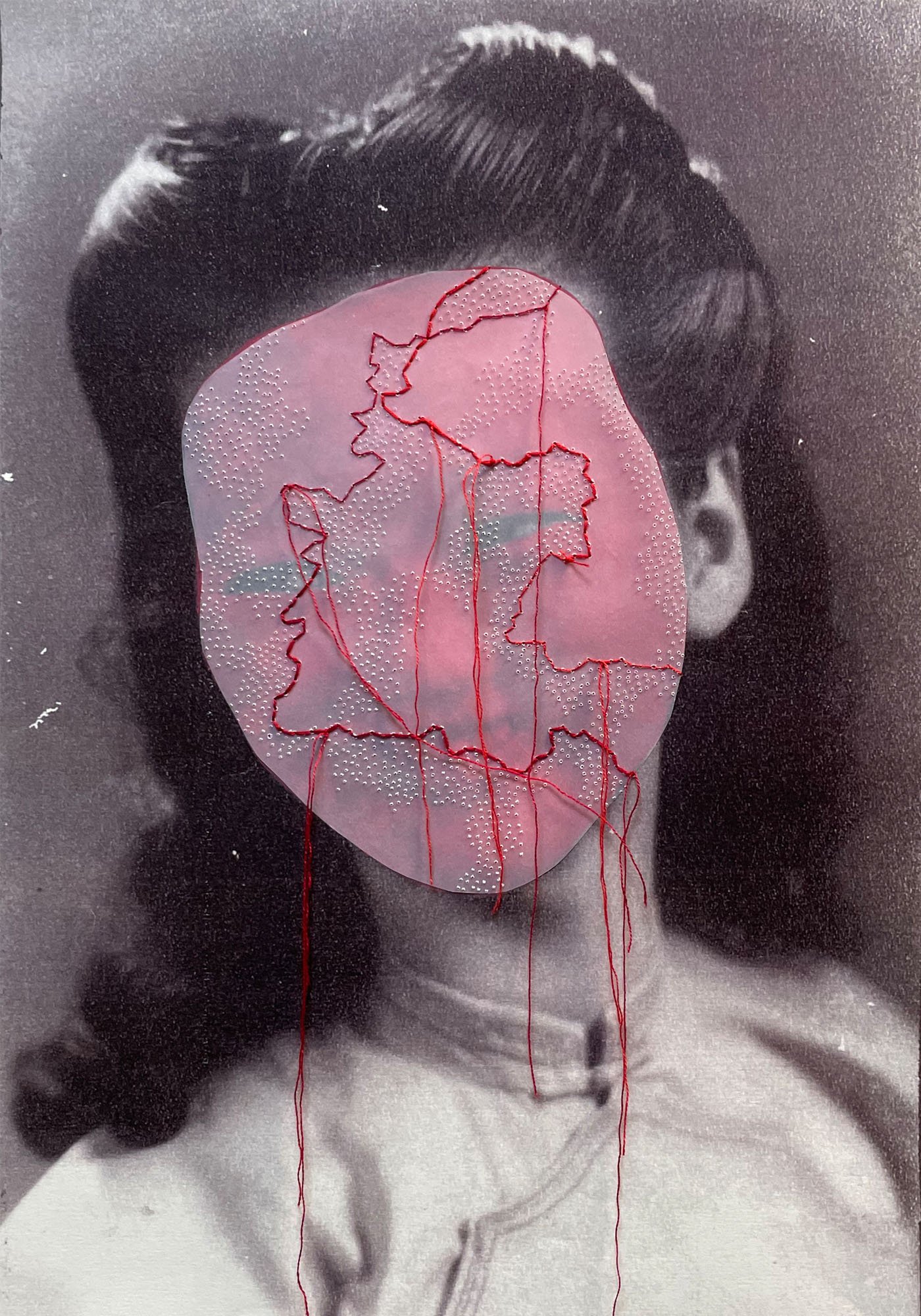 Topographies of Diaspora, 2022, photocopy, acrylic paint and embroidery thread on cartridge paper. 29.5 x 42cm