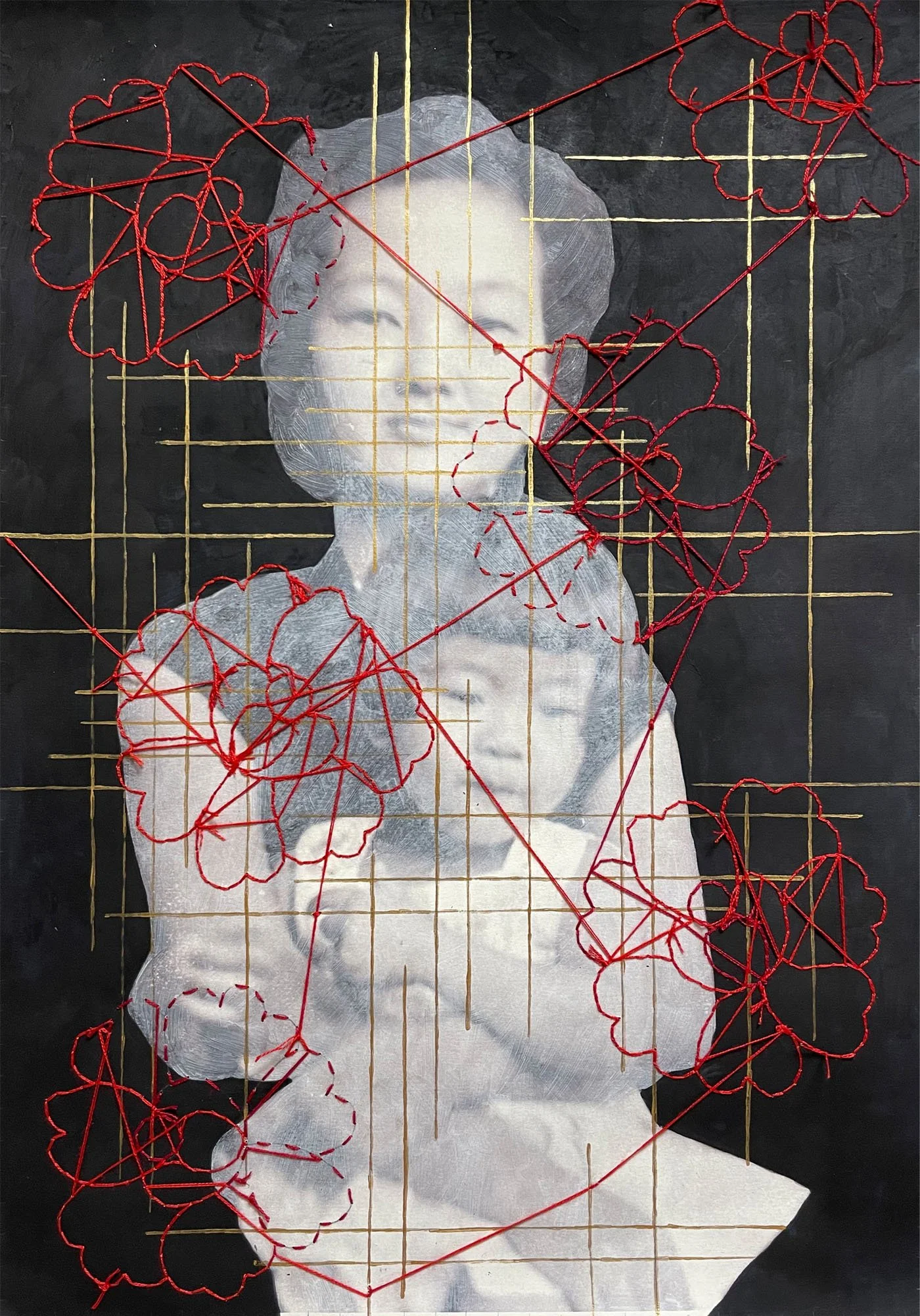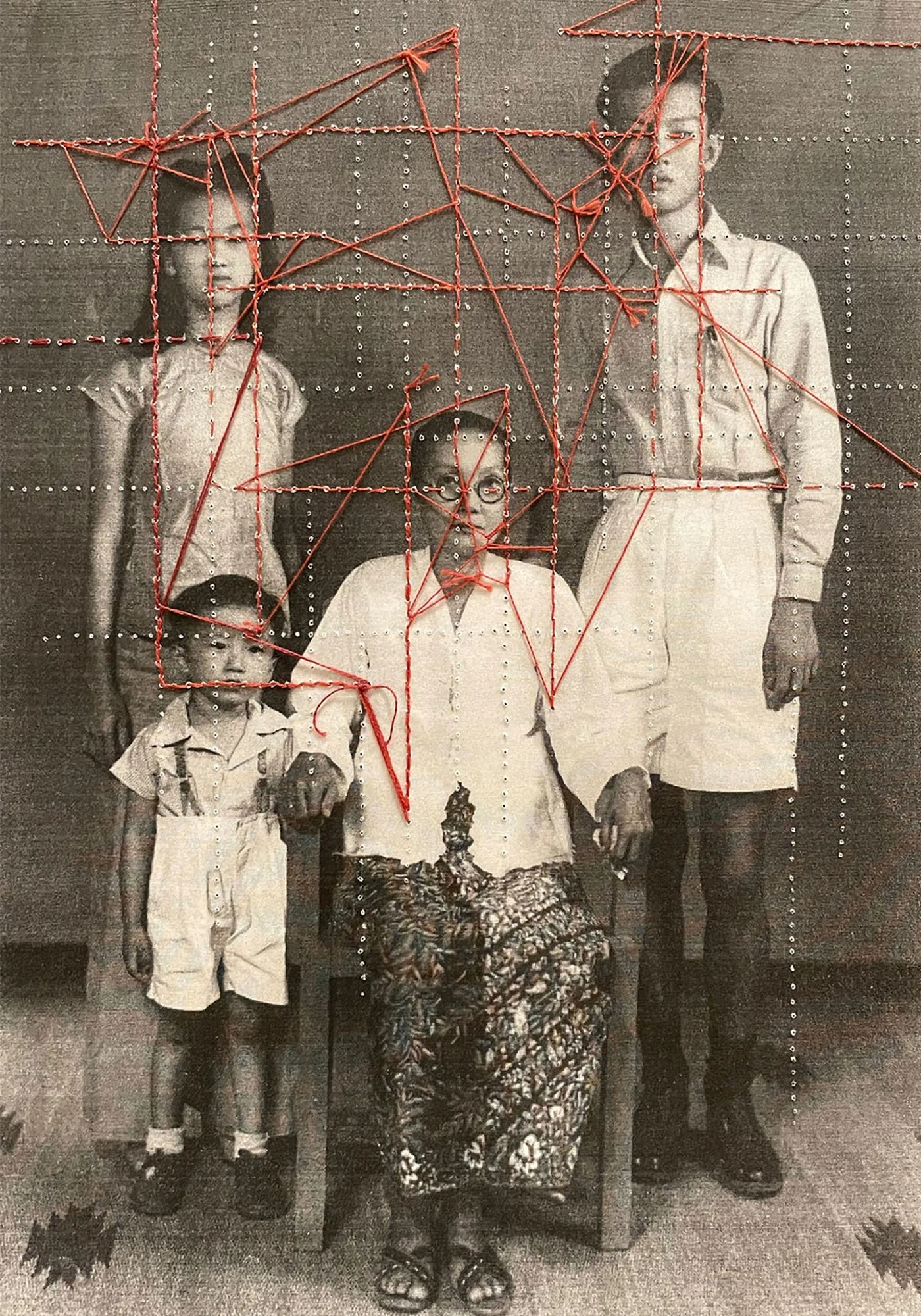Grids and knotted threads recur throughout the work, reflecting a desire to draw connections between past and present. The works incorporate batik imagery central to Singaporean Peranakan craft. Peranakan culture, which fuses Malay, Chinese, and European influences, highlights how trade, migration, colonisation, and slavery in Southeast Asia have shaped local culture. Elements of embroidery reference the complex historical relationship between women and textile labour.